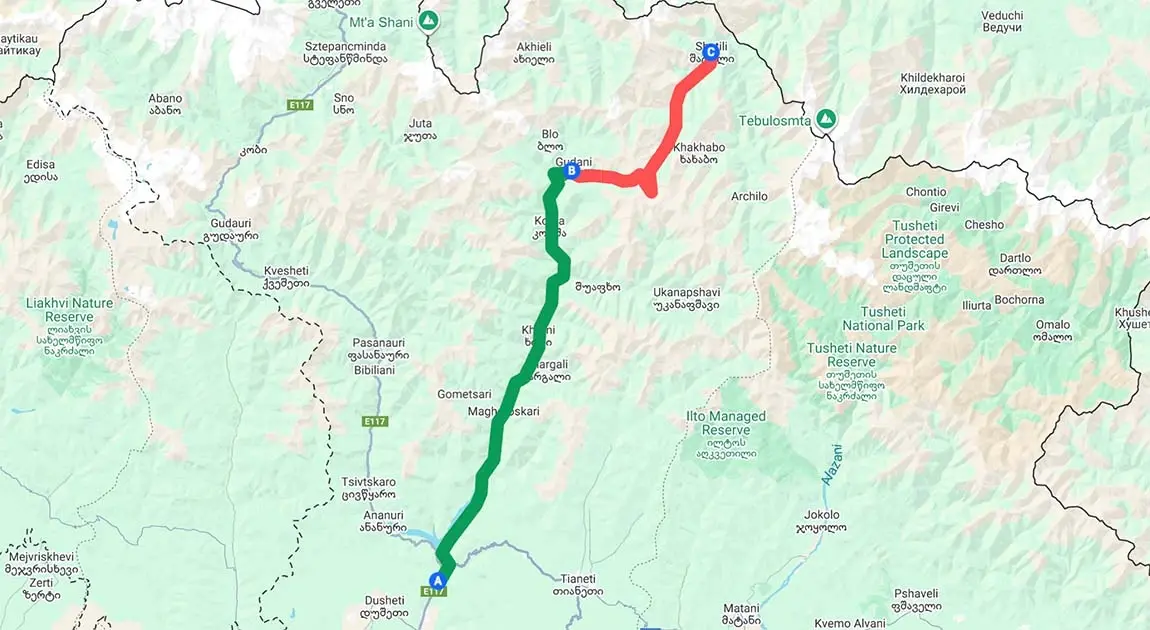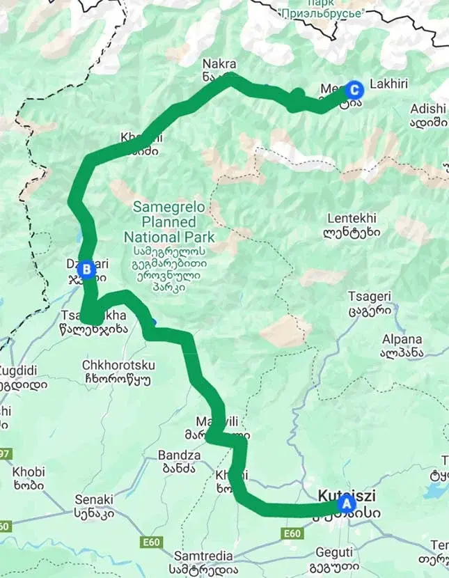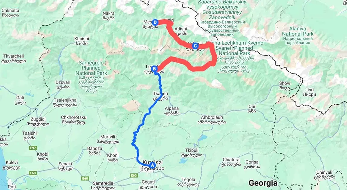 A Google Térkép néha a „Lentekhi – Ushguli – Mesztia” tiltott szakaszon vezeti végig az útvonalat.