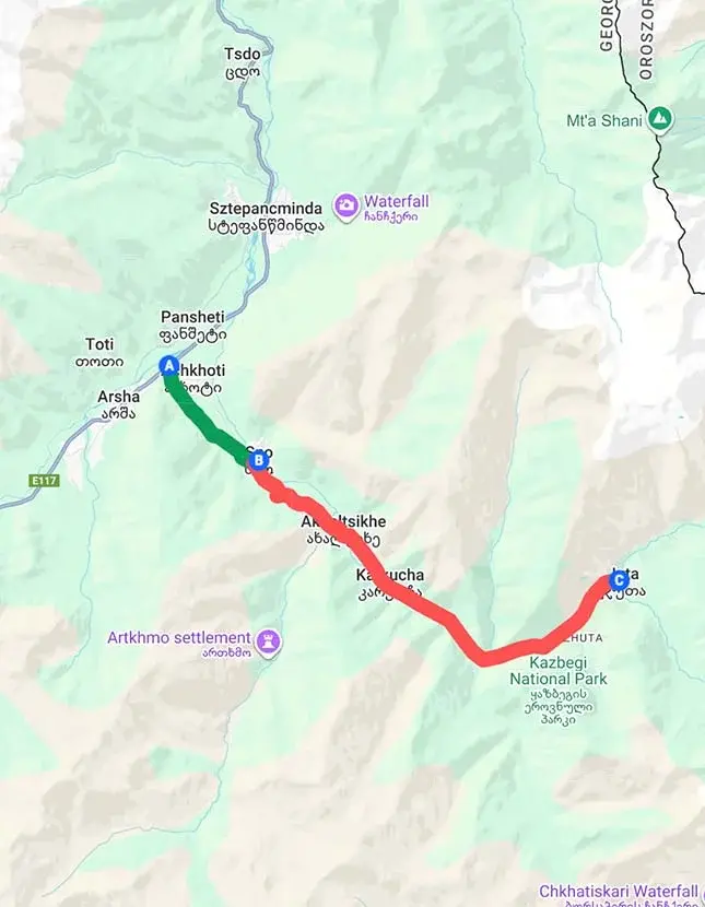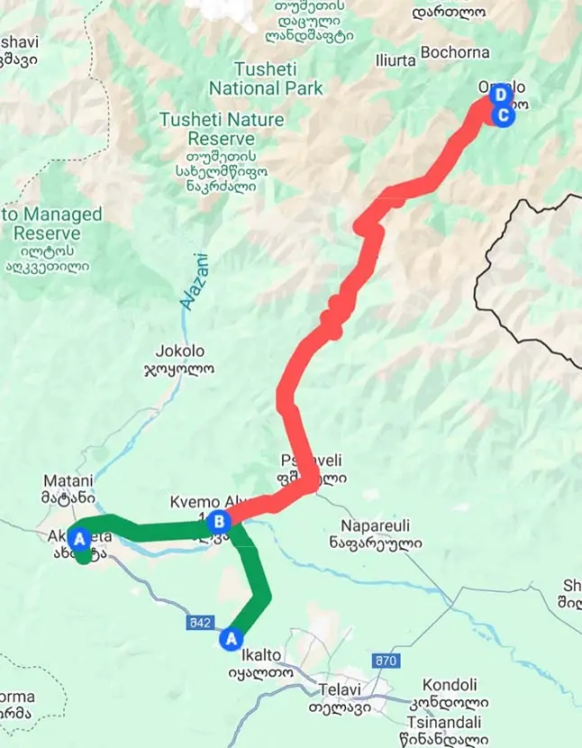 A Kvemo-Alvani – Tusheti – Omalo közti szakasz bérautóval TILOS.
