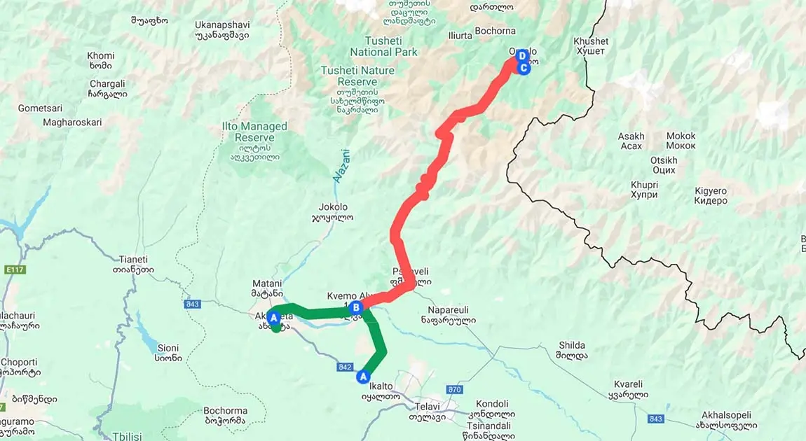 Bérautóval legfeljebb Kvemo-Alvani faluba szabad elmenni – innen csak helyi terepjárós sofőrrel ajánlott továbbhaladni.